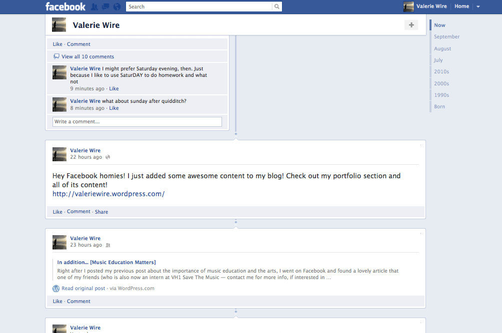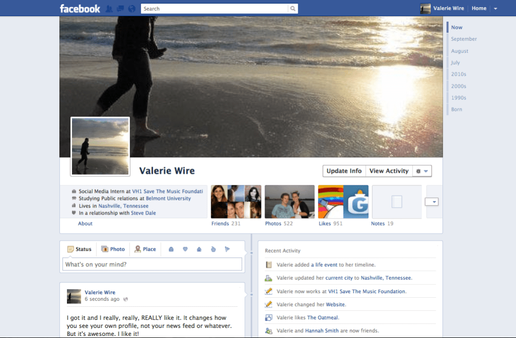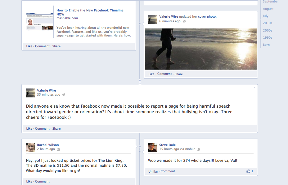 Overall, I really enjoy this new layout and I can’t wait to see more advantages (and maybe even the disadvantages) of it along the way as I and others become more familiarized with it. If you’re as interested as I am, I definitely recommend following the stages on Mashable’s website to get the new timeline before anyone else! It’s easy and worth it!