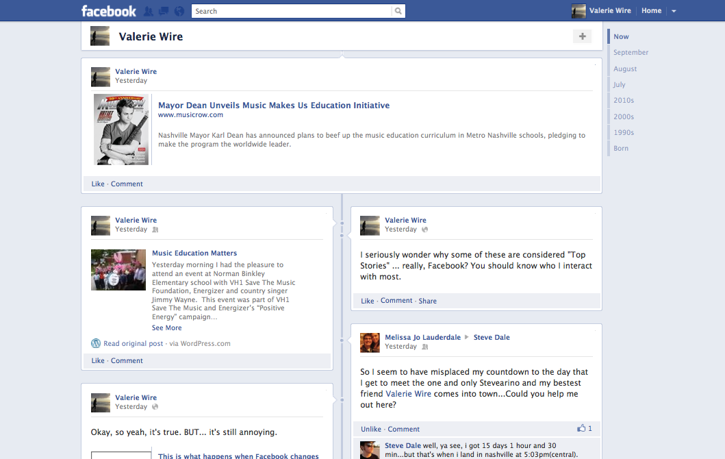 You also see on the side, it has the years that Facebook as been around. If you weren’t on Facebook then, the content is empty. I could, however, go back and insert images or other content as I desire. I could even go back to my birth and insert a photo! If only I had a good image of me as a bald newborn to share with the world…