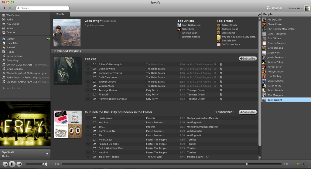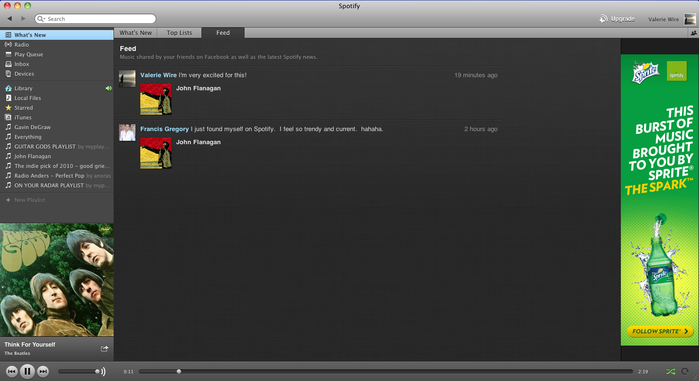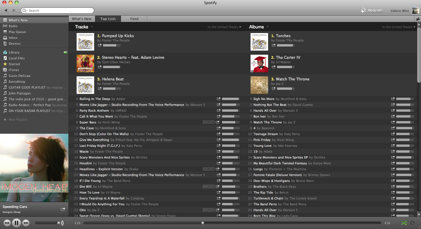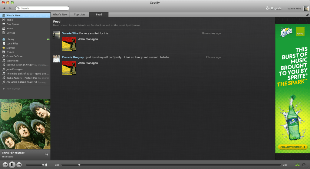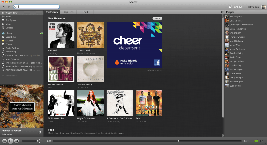 This is the “Whats New” tab… By clicking this, you see what’s hot on Spotify right now, and what’s new. On the right, those are my list of friends from Facebook that are using Spotify! On the bottom left corner, you can also note the album artwork as well as the song and artist that is currently playing, with all the buttons along the bottom. Above that, you can see the place for all the playlists you can create, as well as different links for different things, such as your Queue (which I’m not sure what that is mainly used for, yet), your iTunes library, and more.