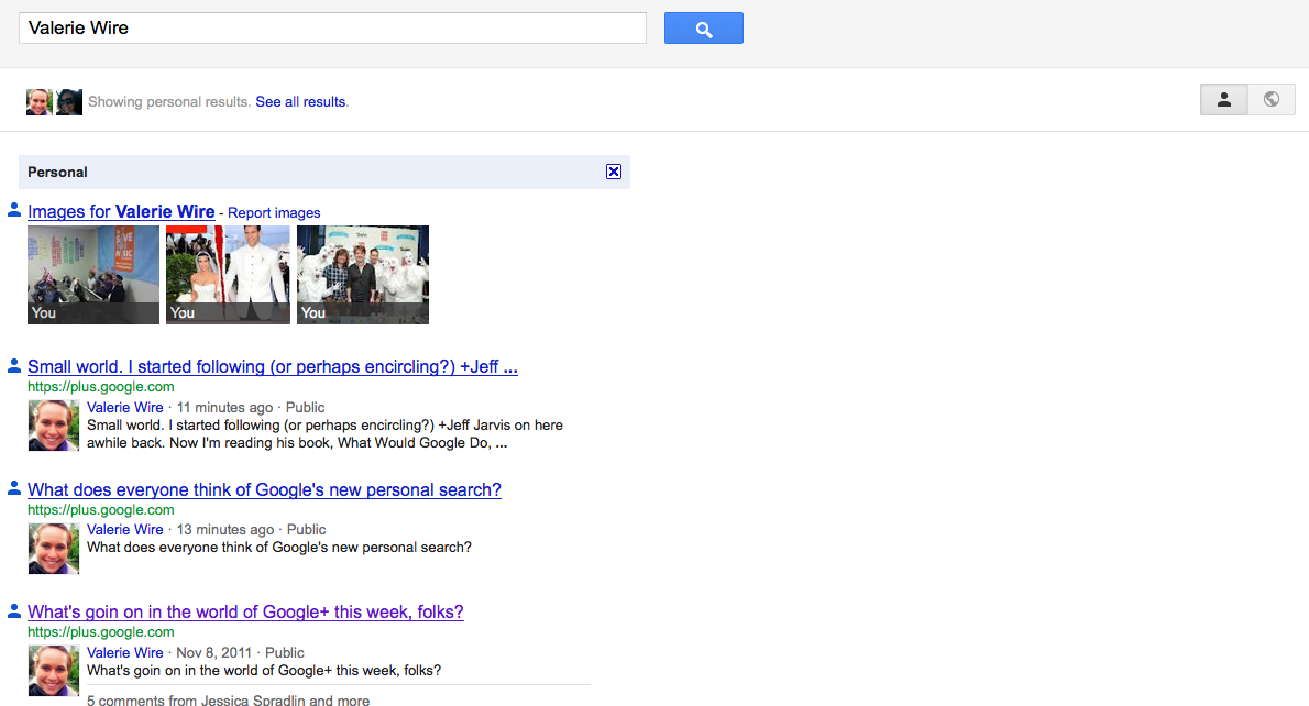 The point: when signed in to a Google+ account and searching a person’s name, “personal search” results come up first. What does this mean? Well, let’s take a look.